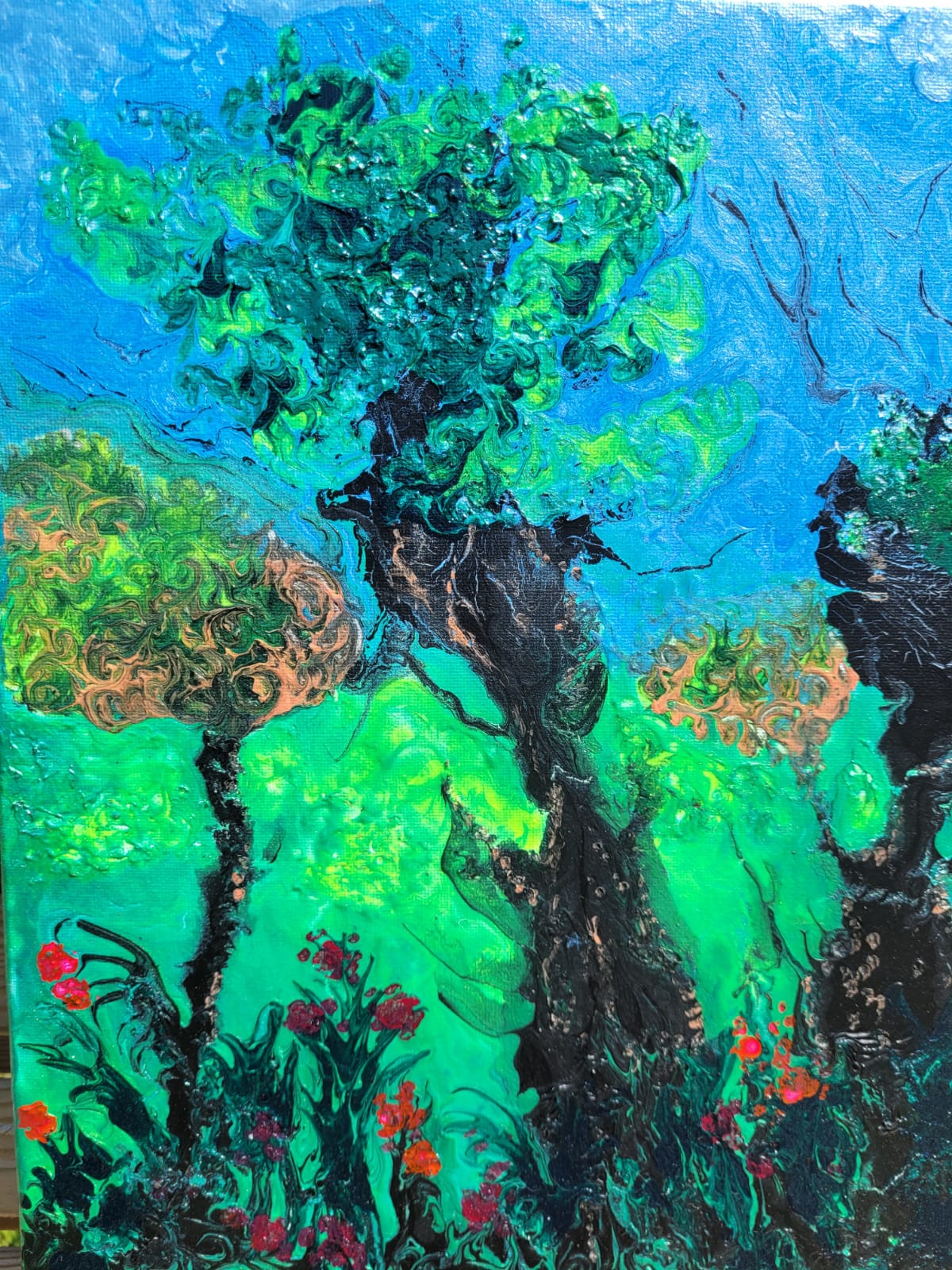 Trees swaying in the wind with flowers in the forefront. A lovely bright vibrant picture with bright bursts of colour.