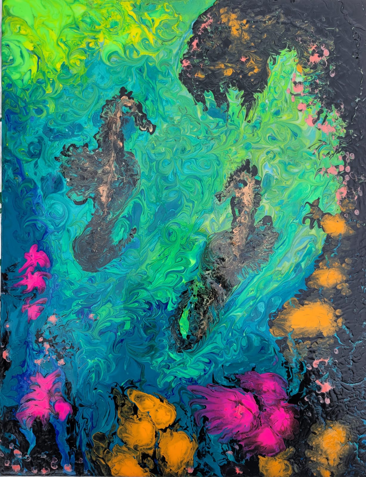 An abstract picture with a suggestion of Seahorses playing amongst the coral. A mixture of colours with a sureal feel.