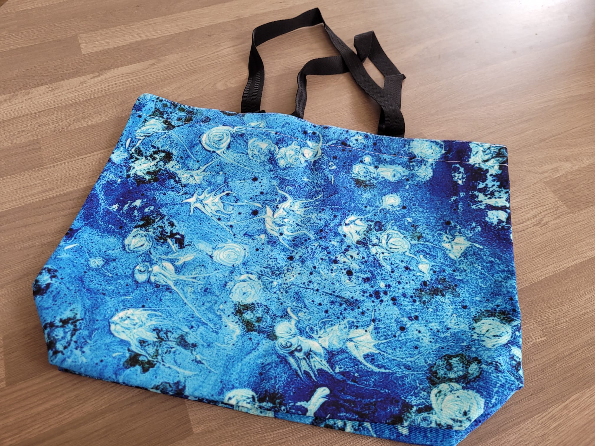 Shades of blue and glistening silver, filled with imaginary creatures from the sea.